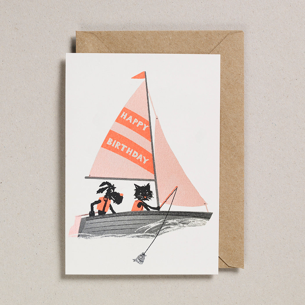 Illustrated by Rusty Studio, this Rascals 'Sail Boat' riso print greeting card is inspired by vintage annuals and comics. Printed on the studio risograph machine using soy based inks.