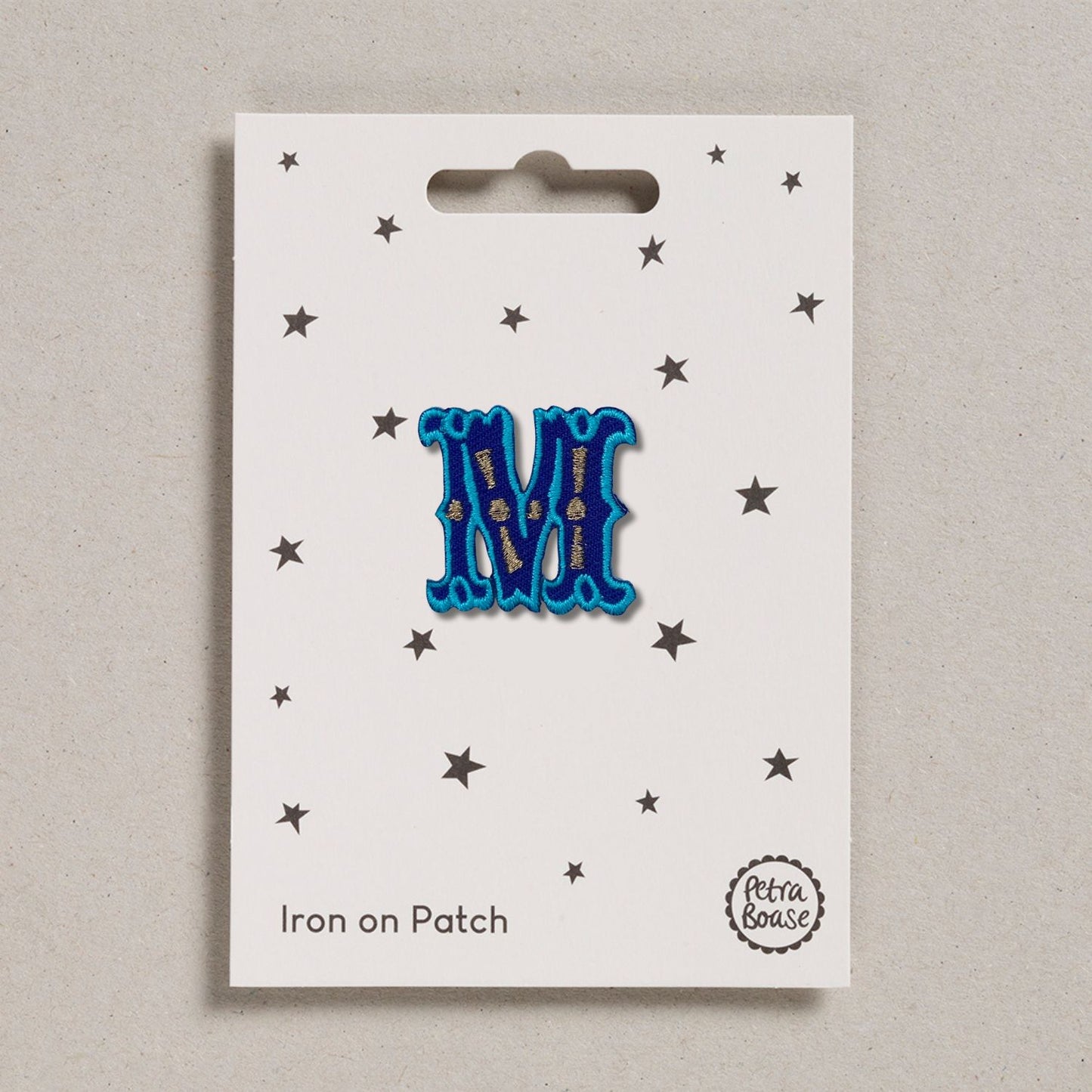 A richly embroidered circus inspired “M” patch with an iron-on backing. The patch is a deep blue with turquoise stitch ending and an accent of light brown metallic thread.