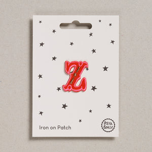A richly embroidered circus inspired "Z" patch with an iron-on backing. The patch is a bold red, with fluorescent pink embroidered edging and orange metallic stitch detail.