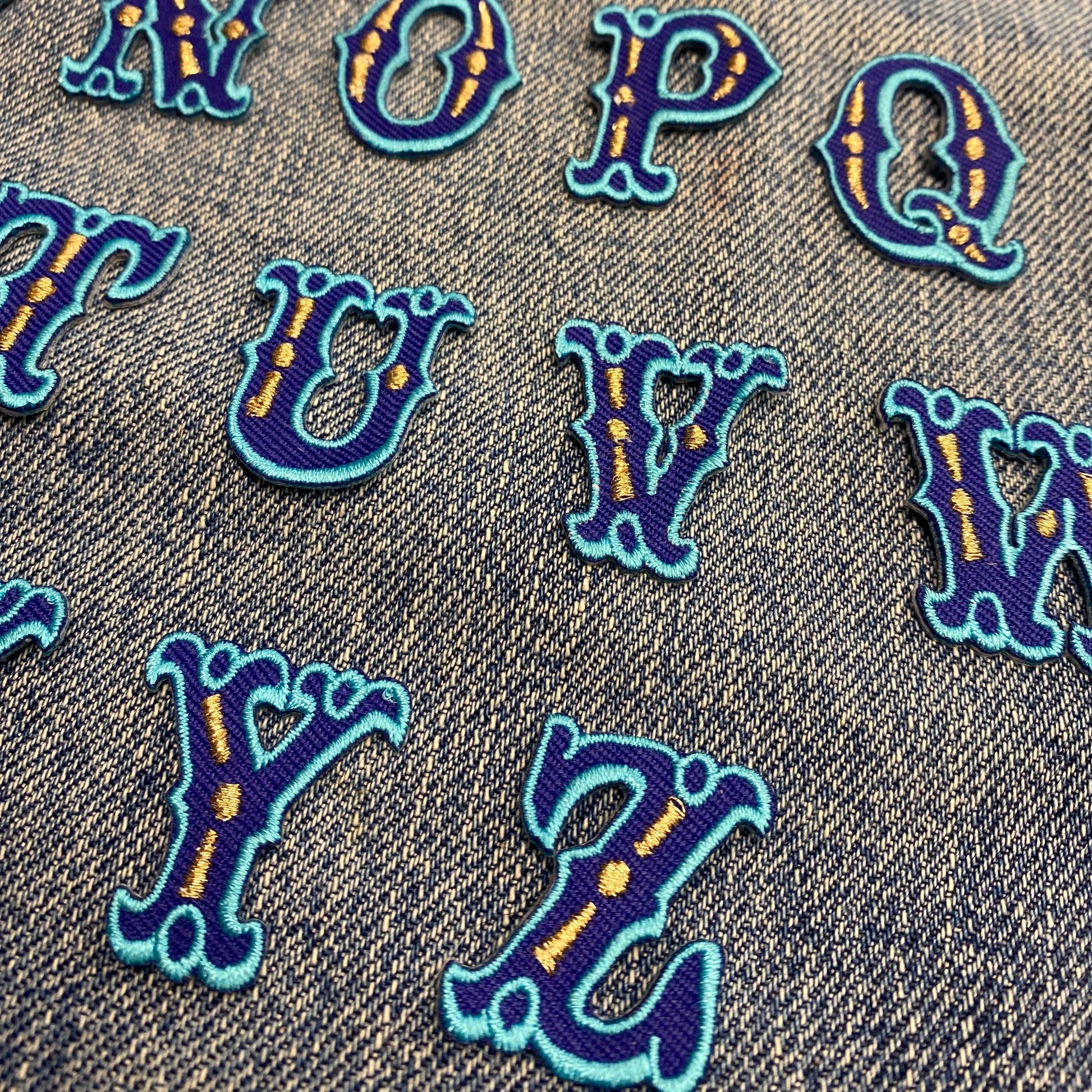 Richly embroidered circus inspired letter patches with an iron-on backing. The patches are a blue, with embroidered edging and metallic stitch detail. Use the dropdown menu to choose your letters and then add to cart.