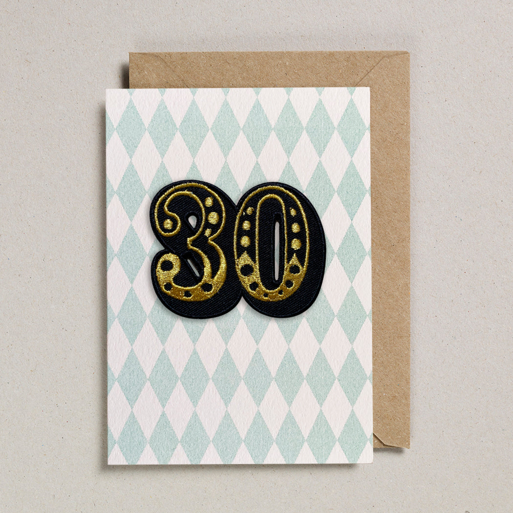 This celebration Iron on Patch '30' greeting card is a unique Risograph print using soy based inks.