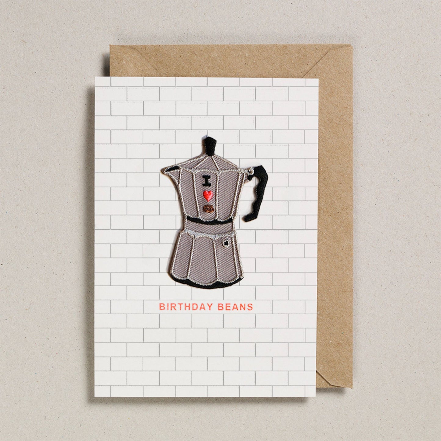 This Iron on 'Moka Pot’ embroidered patch greeting card is on a unique Risograph print card using soy based inks.