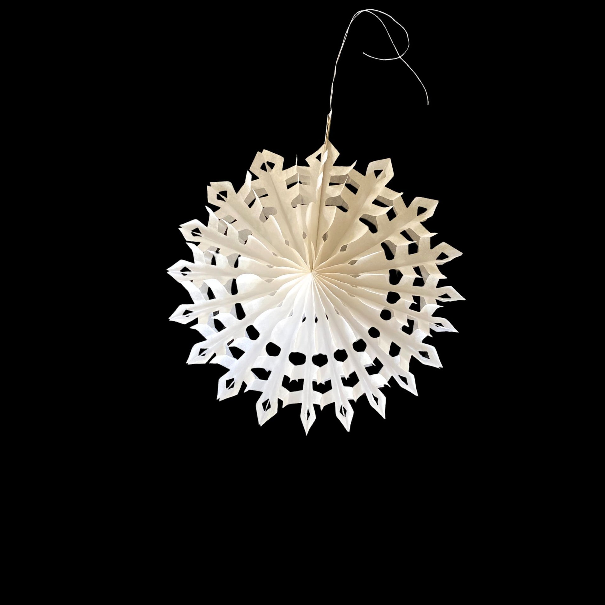 Eco friendly paper snowflake fan decoration.Easy to hang up with the supplied thread. Once the festivities are over it can be folded flat and put away until the following year.