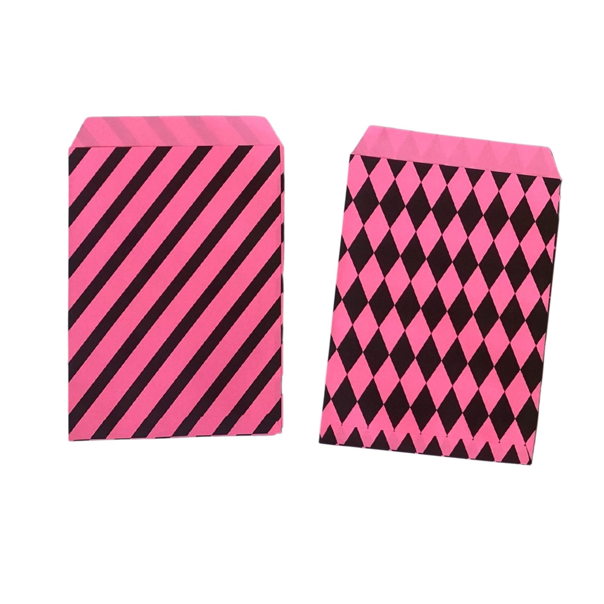 A pack of 20 mixed harlequin & stripe flouro pink and black paper bags. Perfect for party favours and small gifts or paper crafting projects.