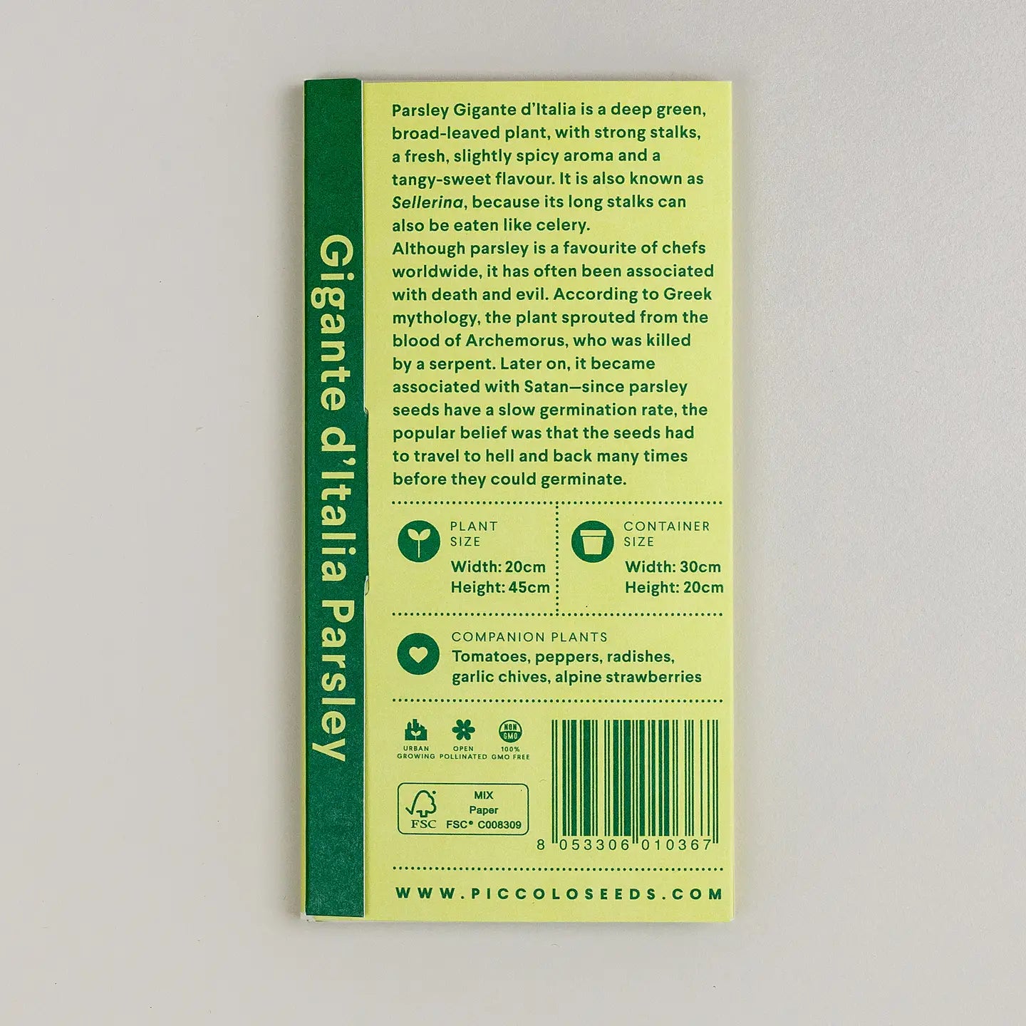Parsley Gigante d’Italia is a deep green, broad-leaved plant, with strong stalks, a fresh, slightly spicy aroma and a tangy-sweet flavour. Also known as Sellerina, because its long stalks can also be eaten like celery, parsley is a particularly high yielding variety that is well suited to autumn cultivation due to its resistance to the cold. Although parsley is a favourite of chefs worldwide, it has often been associated with death and evil. According to Greek mythology, the plant sprouted from the blood of the infant prince Archemorus, who was killed by a serpent. Later on, it became associated with Satan—since parsley seeds have a slow germination rate, the popular belief was that the seeds had to travel to hell and back many times before they could germinate.