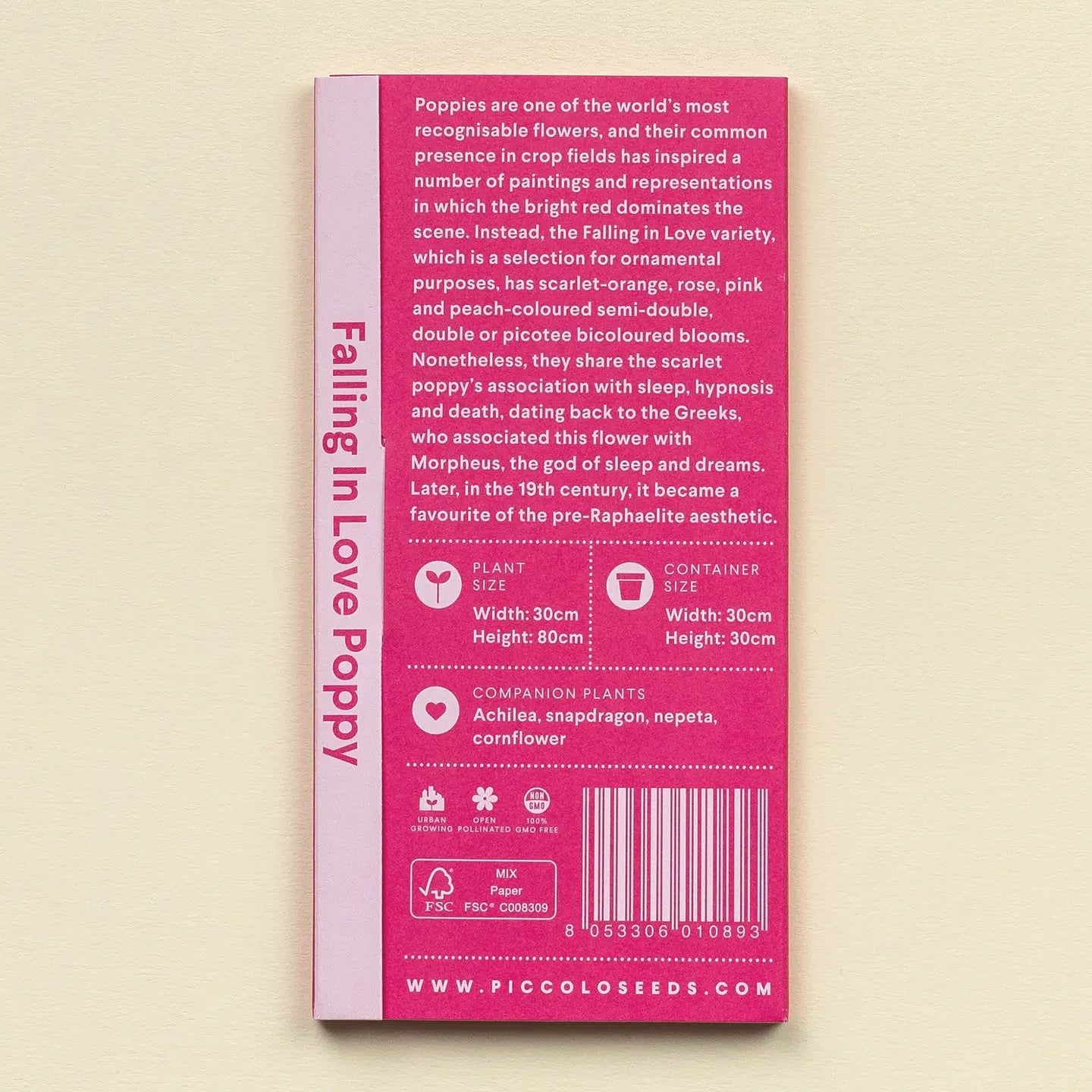 Poppies are one of the world’s most recognisable flowers, and their common presence in crop fields has inspired a number of paintings and representations in which the bright red dominates the scene. Instead, the Falling in Love variety, which is a breed selection for ornamental purposes, has scarlet-orange, rose, pink and peach-coloured semi-double, double or picotee bicoloured blooms. Nonetheless, they share the scarlet poppy’s association with sleep, hypnosis and death, dating back to the Greeks, who associated this flower with Morpheus, the god of sleep and dreams. Later, in the 19th century, it became a favourite of the pre-Raphaelite aesthetic.