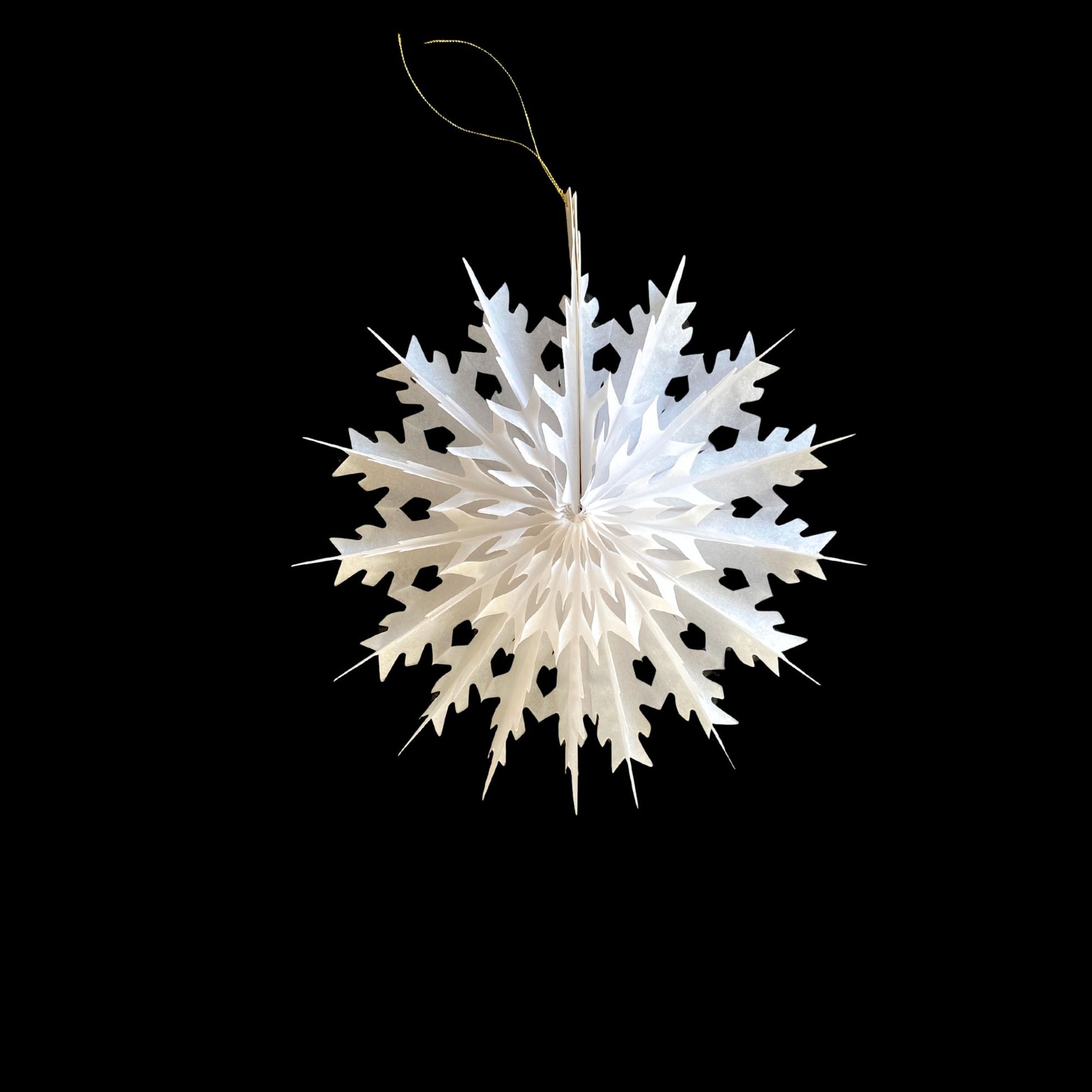 Eco friendly paper snowflake fan decoration.Easy to hang up with the supplied thread. Once the festivities are over it can be folded flat and put away until the following year.